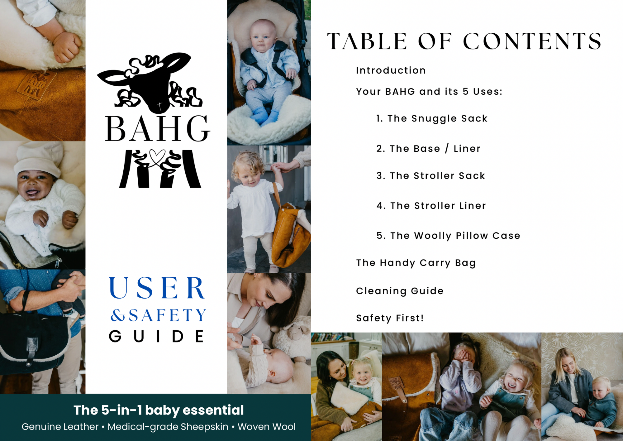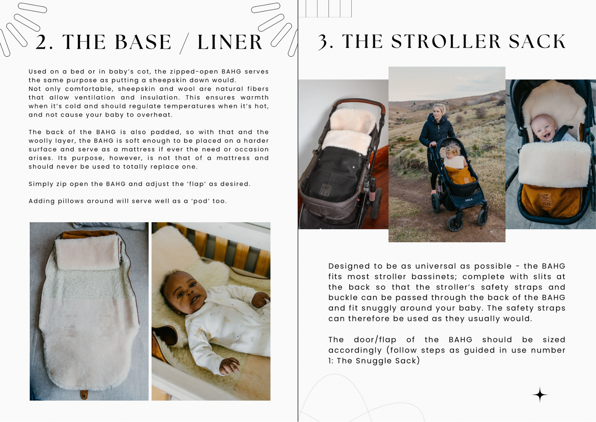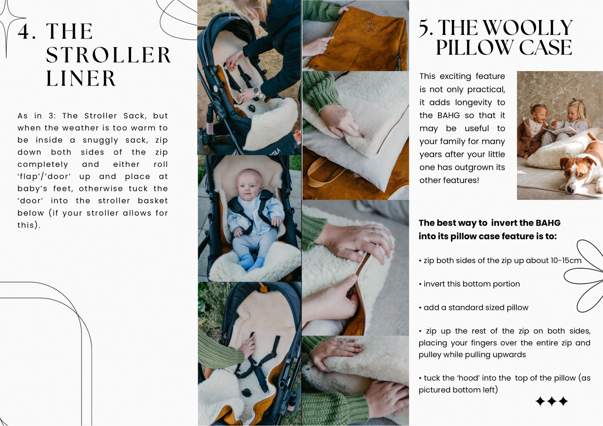 The versatile BAHG functions as a: Snuggle Sack, Bed/Cot Liner, Stroller Sack and Stroller Liner. It also converts into a cuddly Standard-sized sheepskin and wool Pillow Case - to be used for many years after your little one has outgrown its other uses!