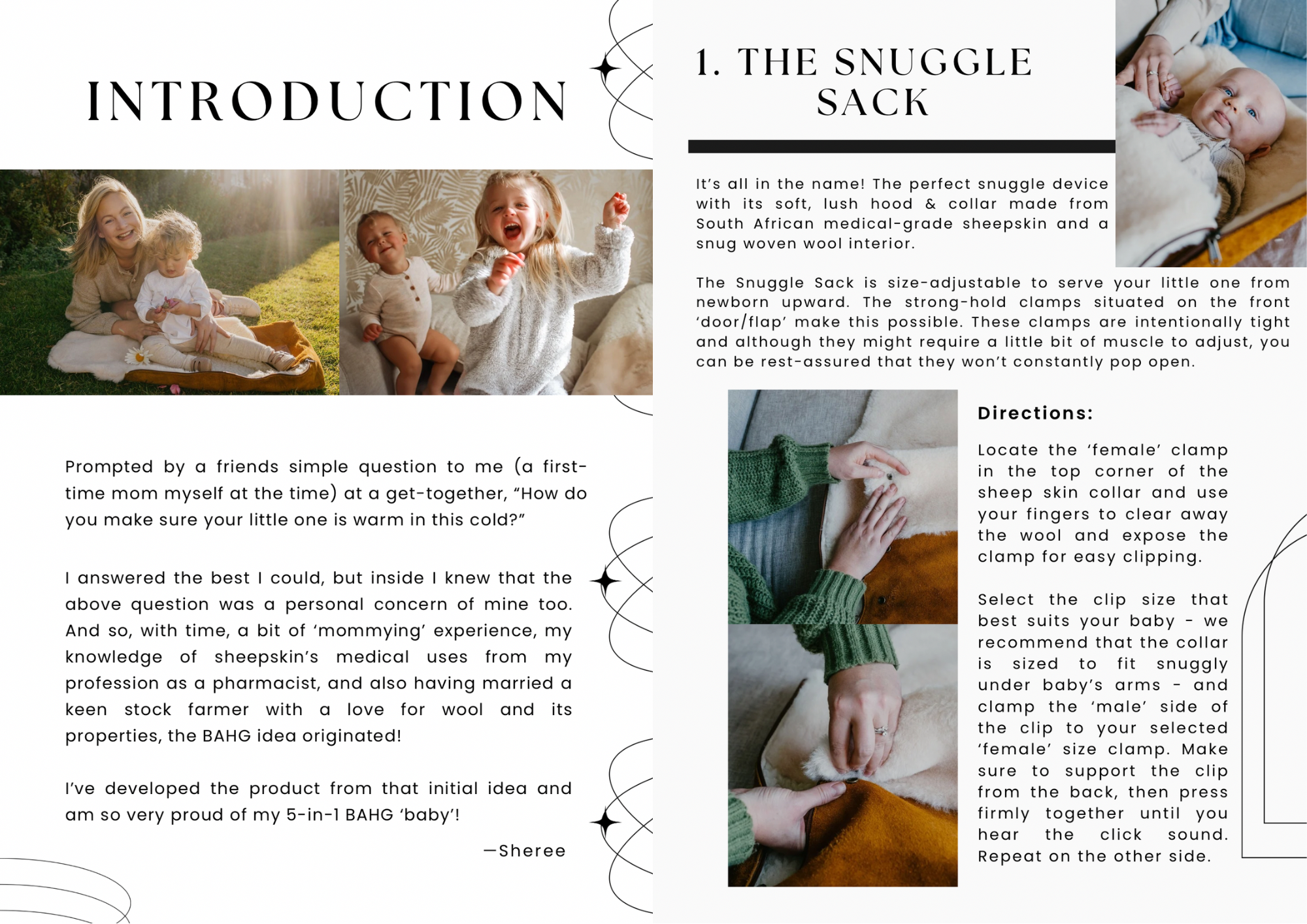 Itβs all in the name! The perfect snuggle device with its soft, lush hood & collar made from South African medical-grade sheepskin and a snug woven wool interior. The Snuggle Sack is size-adjustable to serve your little one from newborn upward.