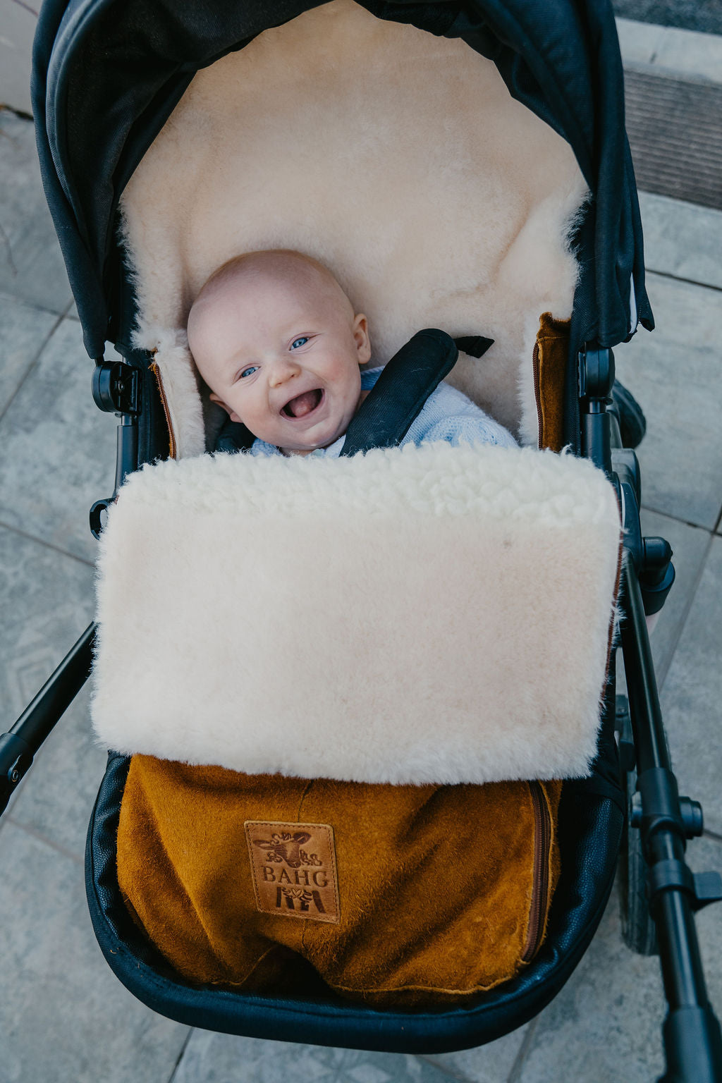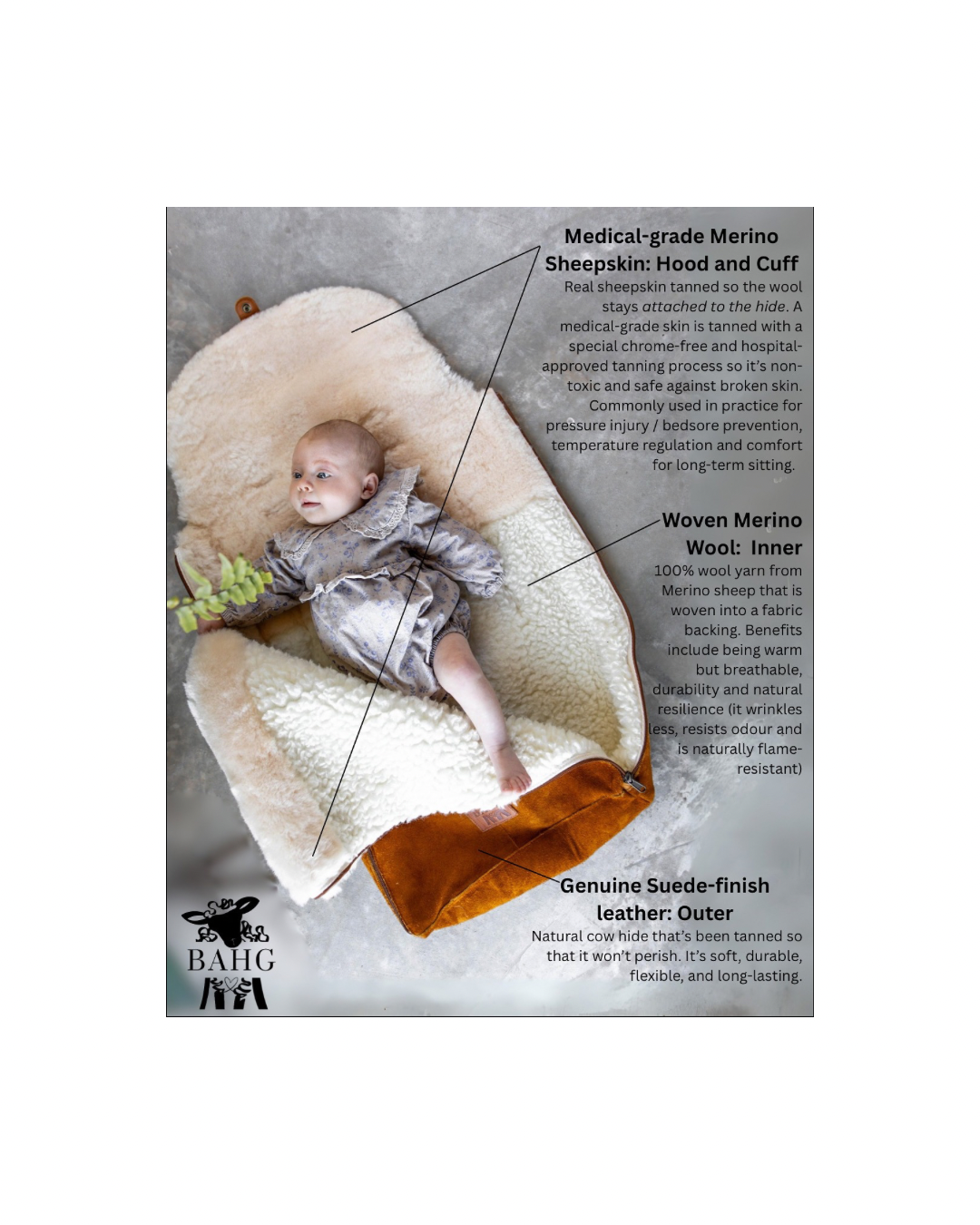 A South African first, combining beautiful Natural textiles: Genuine Leather, Medical-grade Sheepskin and lush Woven Wool in a 5-in-1 design for your baby/toddler.